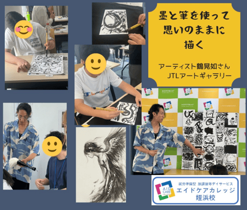 7/12のJTLアート教室ではアーティスト鶴晃如さんに参加いただき、筆と墨を使った作品に取り組みました。 書道でしか使ったことがなかった筆や墨を今日は画材として使うことをはじめて体験し、手指運動の苦手なお子さんも思いっきった表現ができ、楽しく活動されていました。...